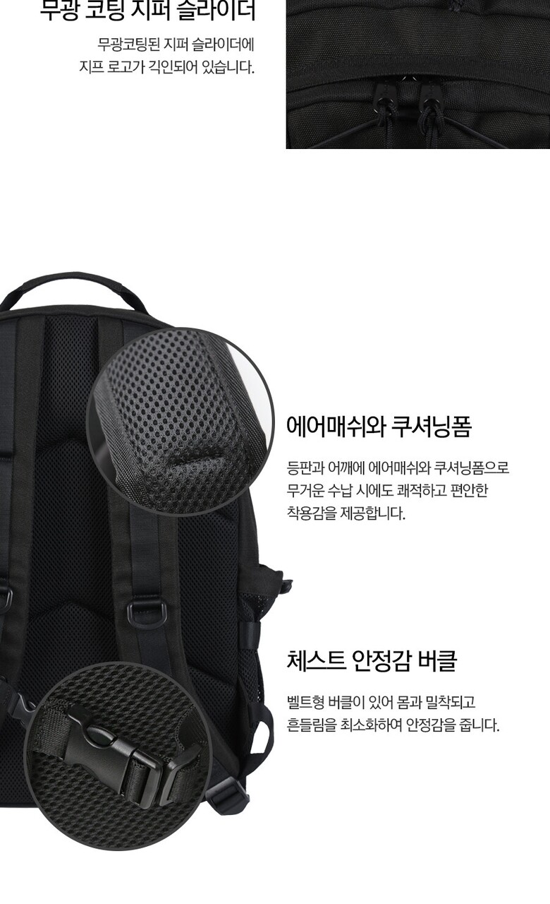 등판과 어깨끈에 에어메쉬와 쿠셔닝폼을 사용하여 무거운 수납시에도 편안한 착용감을 제공하며