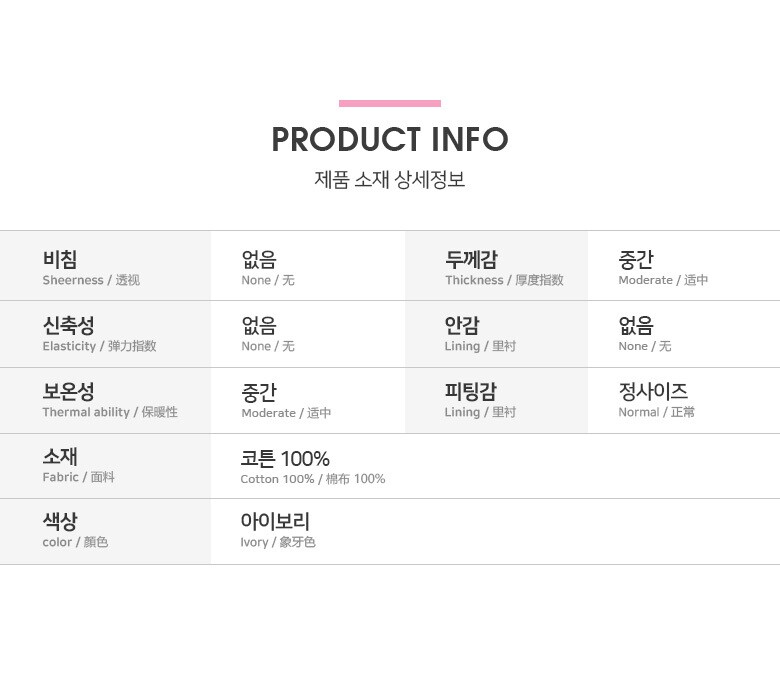 | 1. 제품 소재 (섬유의 조성 또는 혼용률을 백분율로 표시, 기능성인 경우 성적서 또는 허가서) | 면:100% |