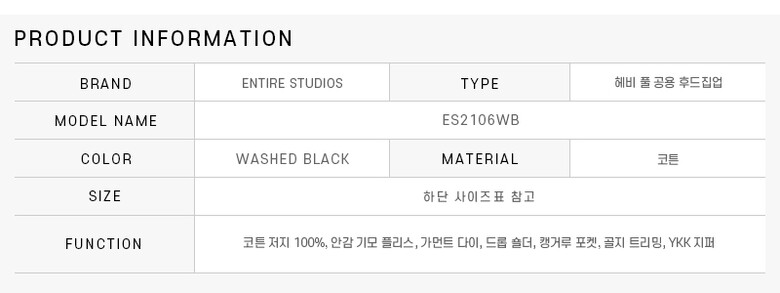 엔타이어스튜디오 ES2106WB (FULL ZIP WASHED BLACK) 헤비 공용 후드집업
