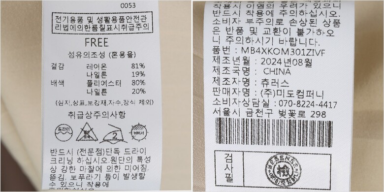 | 1. 제품 소재 (섬유의 조성 또는 혼용률을 백분율로 표시, 기능성인 경우 성적서 또는 허가서) | 겉감-나일론19% 레이온81% 배색-폴리에스터80% 나일론20% |