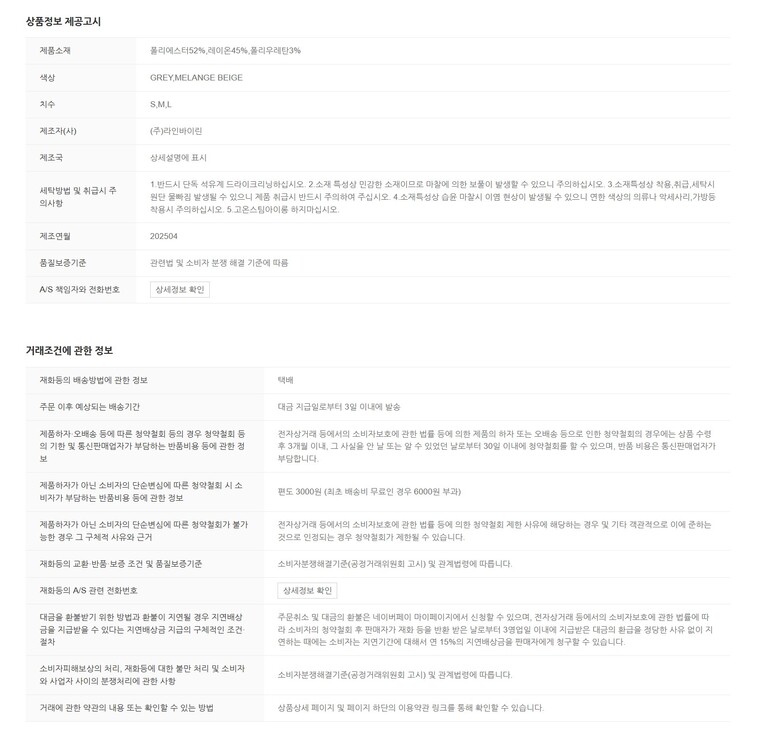 | 1. 제품 소재 (섬유의 조성 또는 혼용률을 백분율로 표시, 기능성인 경우 성적서 또는 허가서) | 상품상세참조 |
