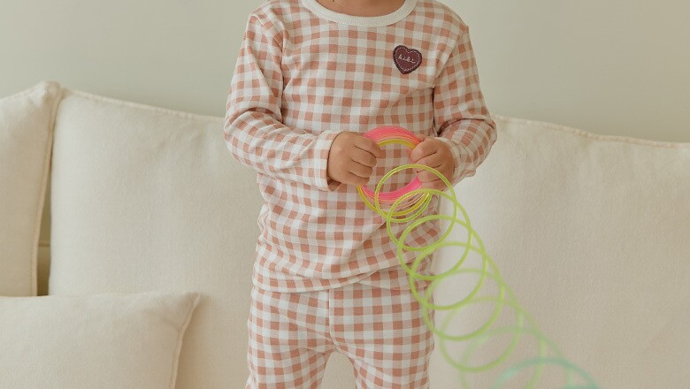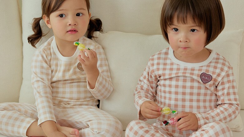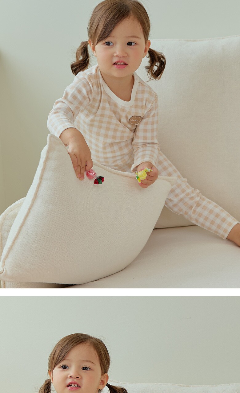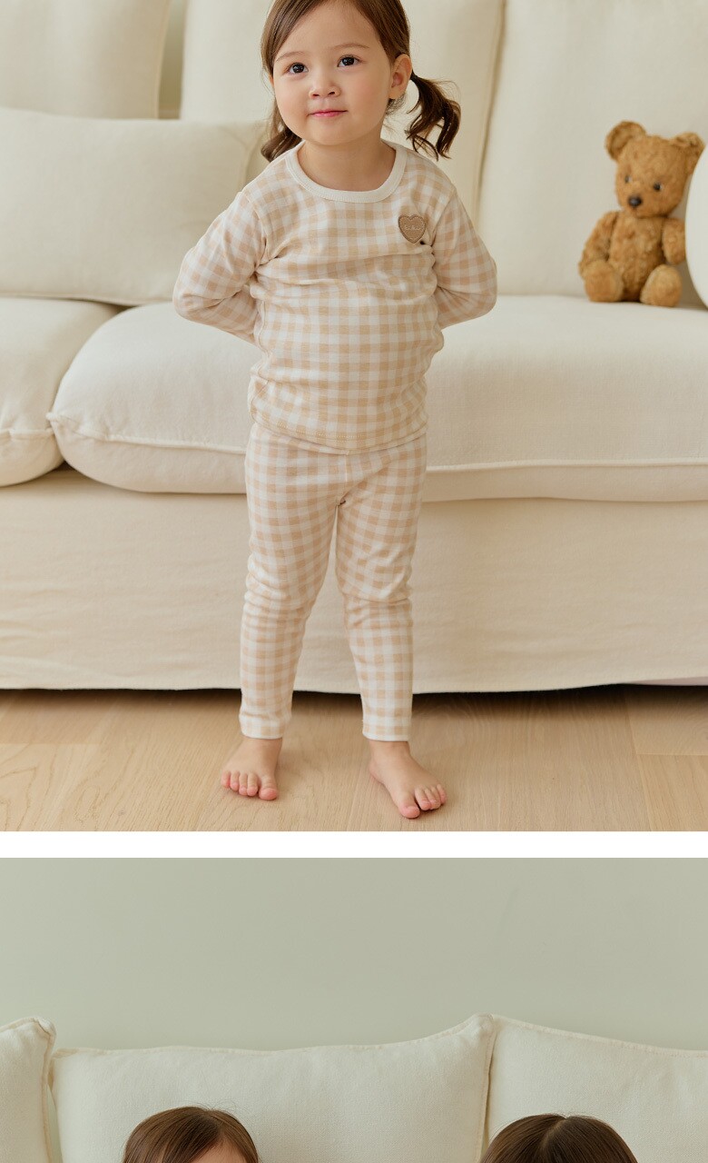 하트와펜 체크 베이지/초코 코튼스판 아기 내복 긴팔 가을 유아 아동 내의 실내복