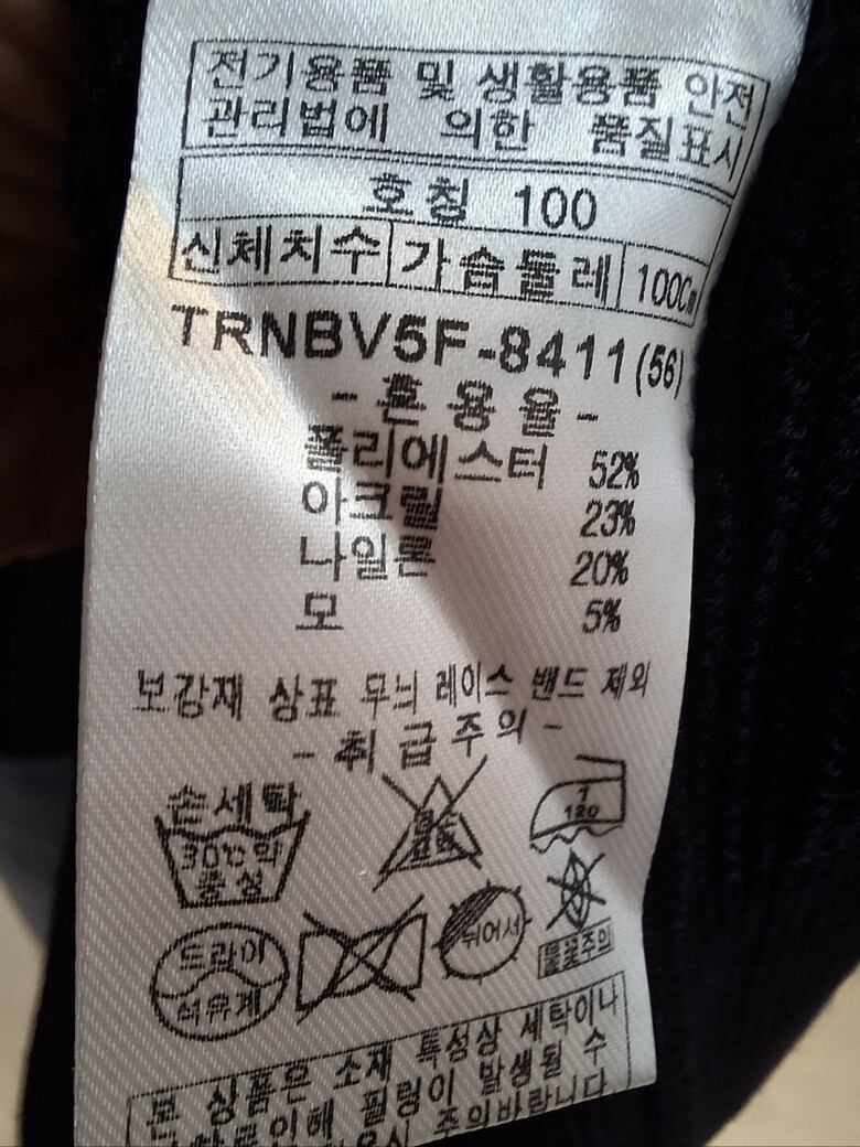 | 1. 제품 소재 (섬유의 조성 또는 혼용률을 백분율로 표시, 기능성인 경우 성적서 또는 허가서) | 폴리에스테르 52%, 아크릴 23%, 나일론 20%, 모 5%, 니트 |