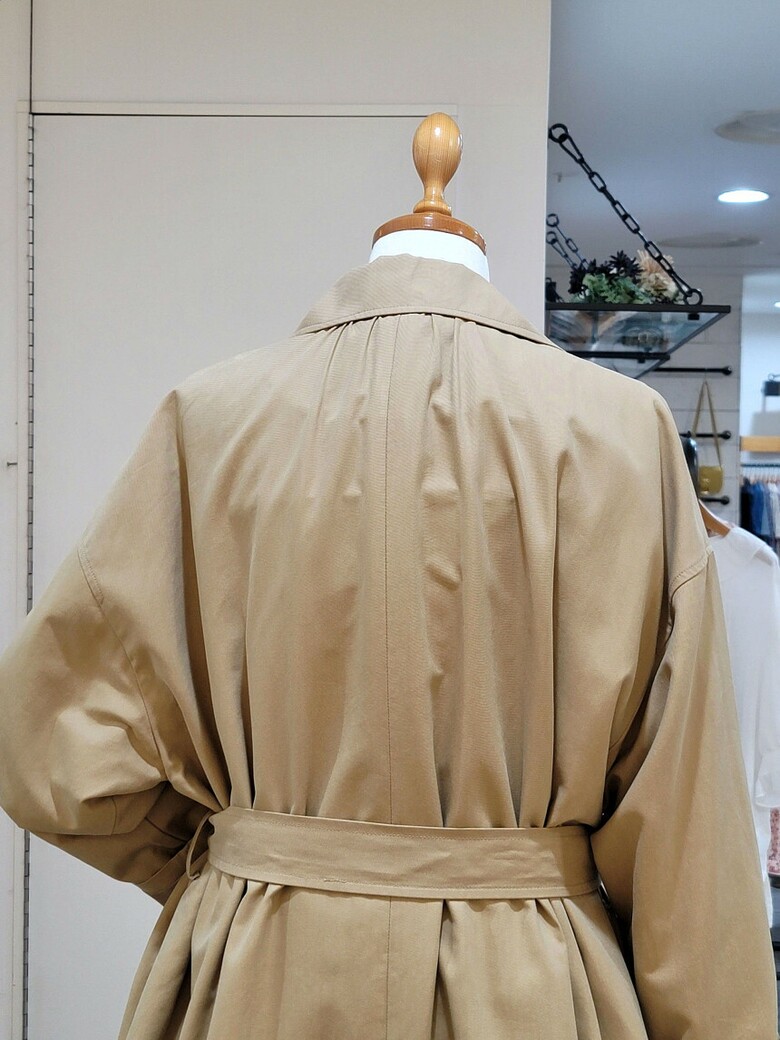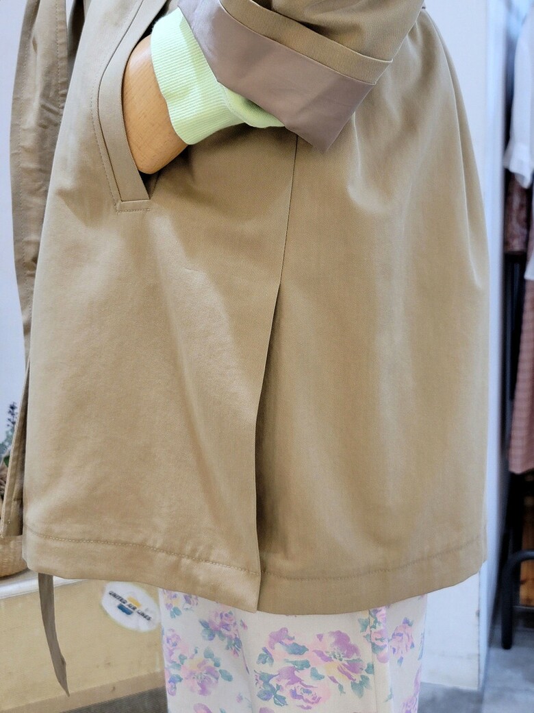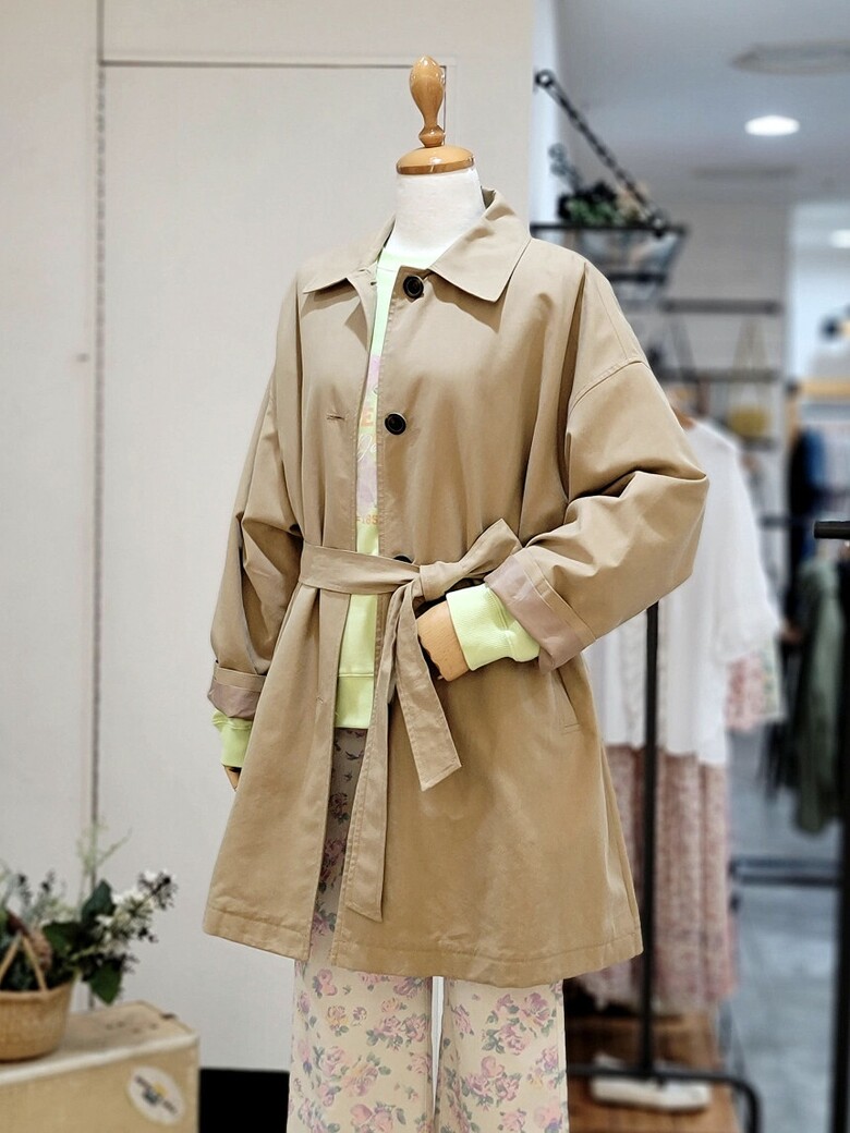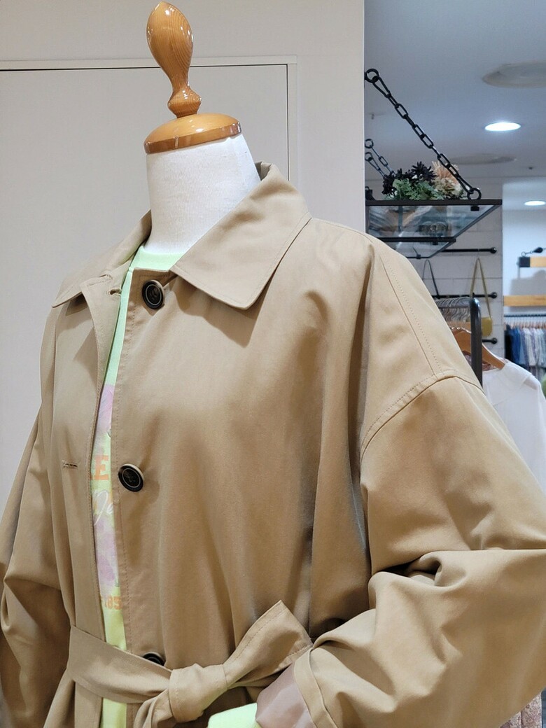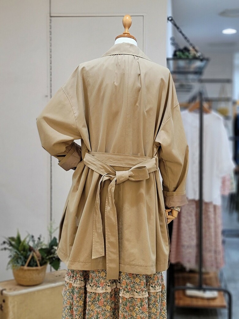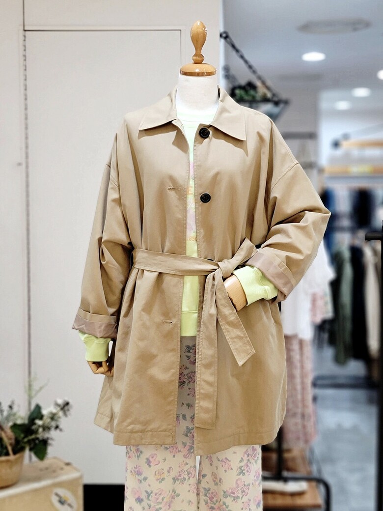 오버한 핏 감의 하프 기장 트렌치코트입니다.