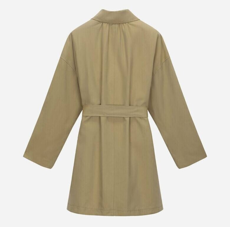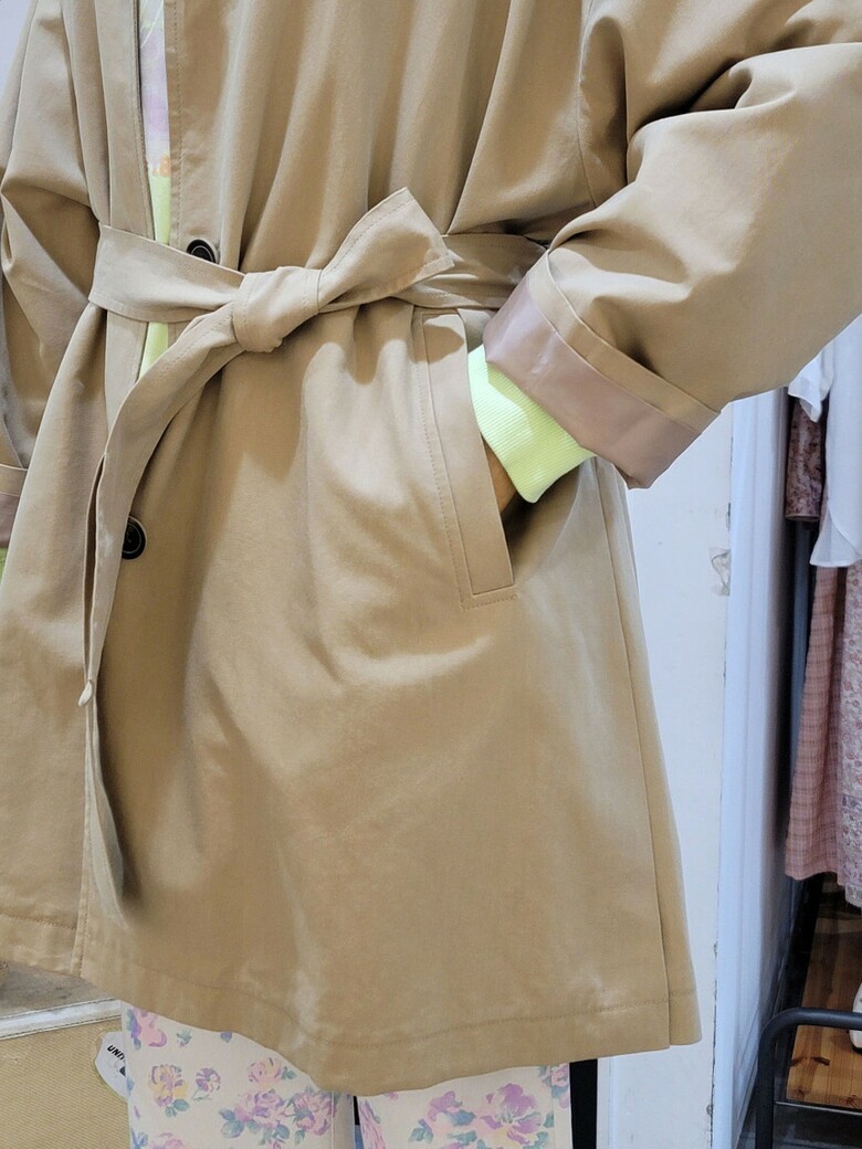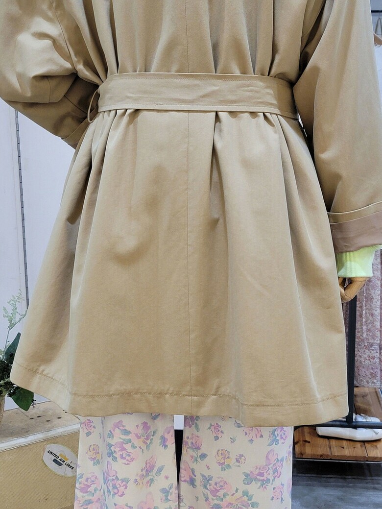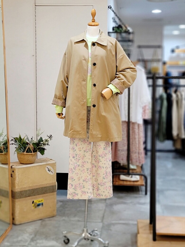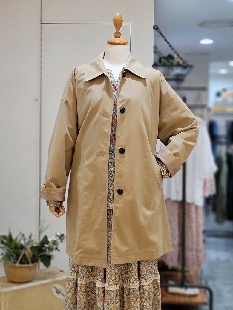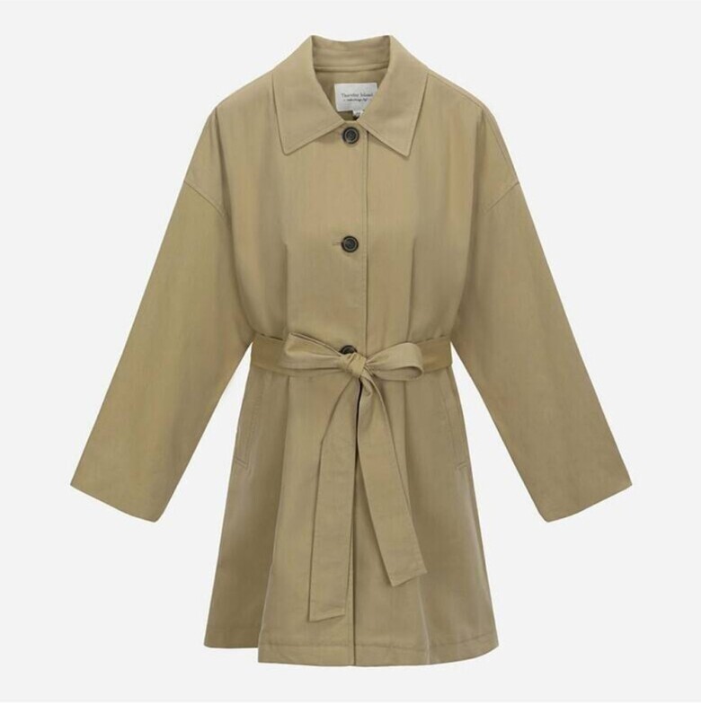 오버한 핏 감의 하프 기장 트렌치코트입니다.