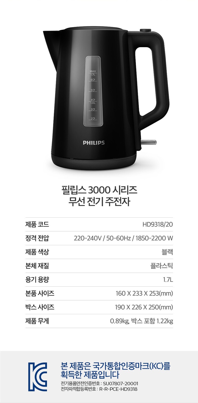 필립스 무선 전기포트 3000 시리즈 HD9318/20