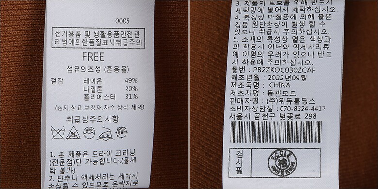 | 1. 제품 소재 (섬유의 조성 또는 혼용률을 백분율로 표시, 기능성인 경우 성적서 또는 허가서) | 겉감-폴리에스터31% 나일론20% 레이온49% |