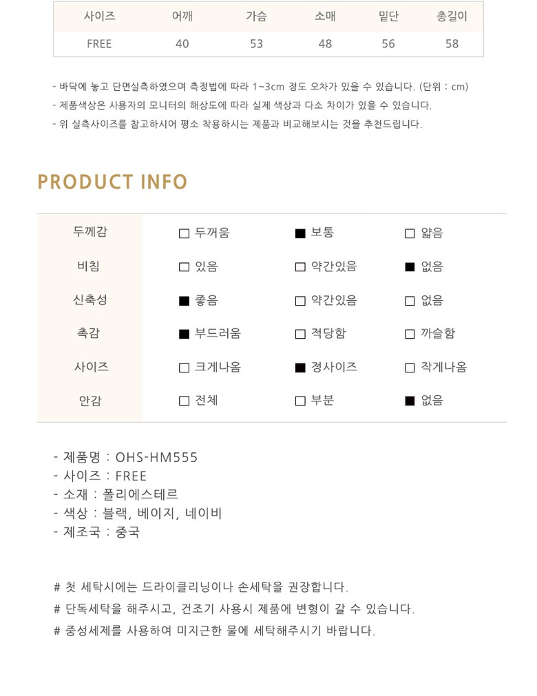1. 제품 소재 (섬유의 조성 또는 혼용률을 백분율로 표시, 기능성인 경우 성적서 또는 허가서) | 상세설명참고 |