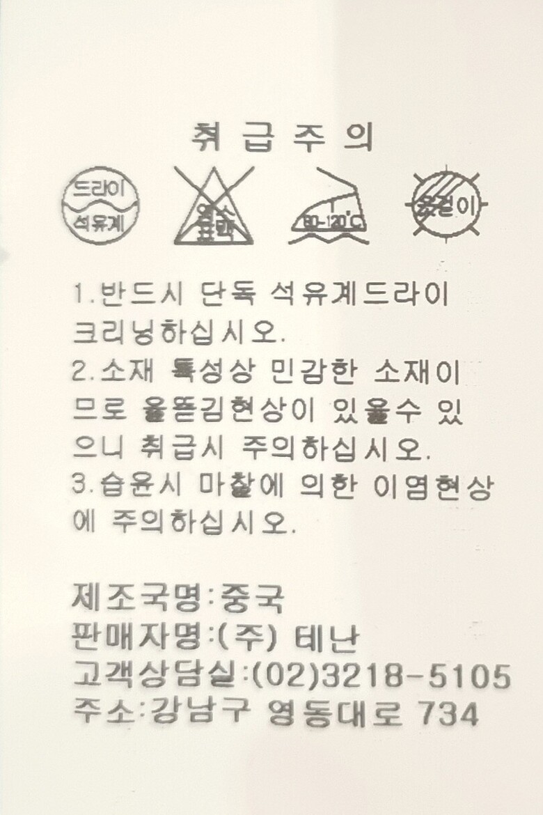 | 6. 세탁방법 및 취급시 주의사항 | 1.반드시 단독 석유계 드라이크리닝하십시오. 2.소재특성상 민감한 소재이므로 올뜯김현상이 있을수 있으니 취급시 주의하십시오. 3.습윤시 마찰에 의한 이염현상에 주의하십시오. |