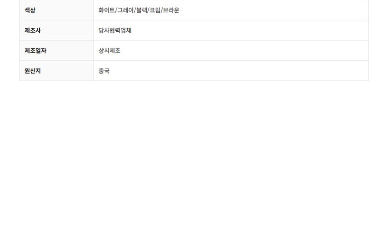 | 1. 제품 소재 (섬유의 조성 또는 혼용률을 백분율로 표시, 기능성인 경우 성적서 또는 허가서) | 상세페이지 기재 |