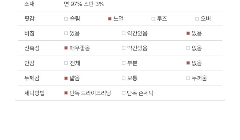 1. 제품 소재 (섬유의 조성 또는 혼용률을 백분율로 표시, 기능성인 경우 성적서 또는 허가서) | 면 97% 스판 3% |