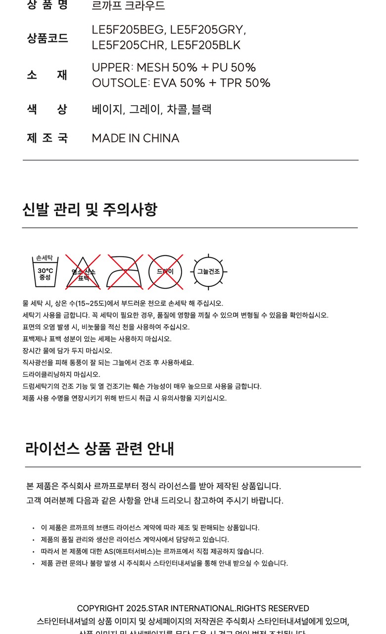 1. 제품 소재 (운동화인 경우에는 겉감, 안감을 구분하여 표시) | 상세페이지참조 |