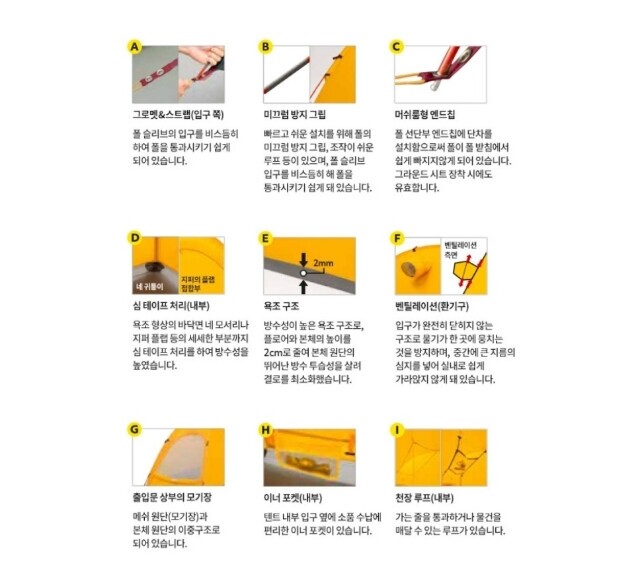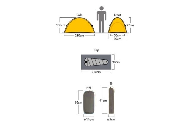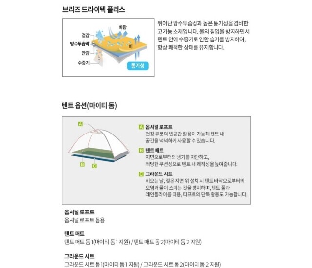 | 1. 제품소재 | 본체 브리즈 드라이 테크 플러스 3레이어 [PTFE라미네이트 가공][겉감 15데니어 바리스틱 나일론 립스탑 (내수압 20,000mm)] 플러스 30데니어 바리스틱 나일론 립스탑 (내수압 1,500mm,우레탄 코팅) 폴 알루미늄 합금(폴 지름)8.5mm |