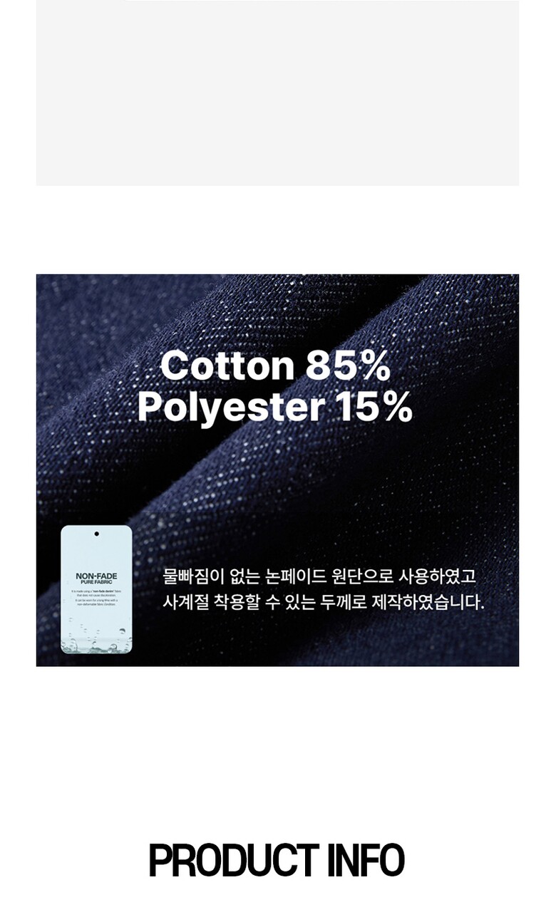 1. 제품 소재 (섬유의 조성 또는 혼용률을 백분율로 표시, 기능성인 경우 성적서 또는 허가서) | 면85%, 폴리에스터15% |