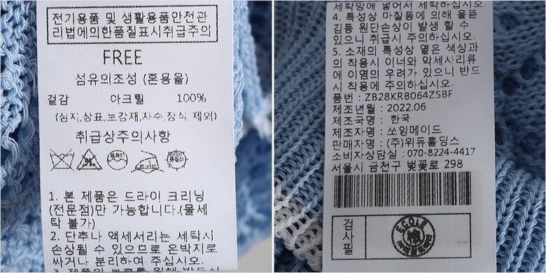| 1. 제품 소재 (섬유의 조성 또는 혼용률을 백분율로 표시, 기능성인 경우 성적서 또는 허가서) | 겉감-아크릴100% |
