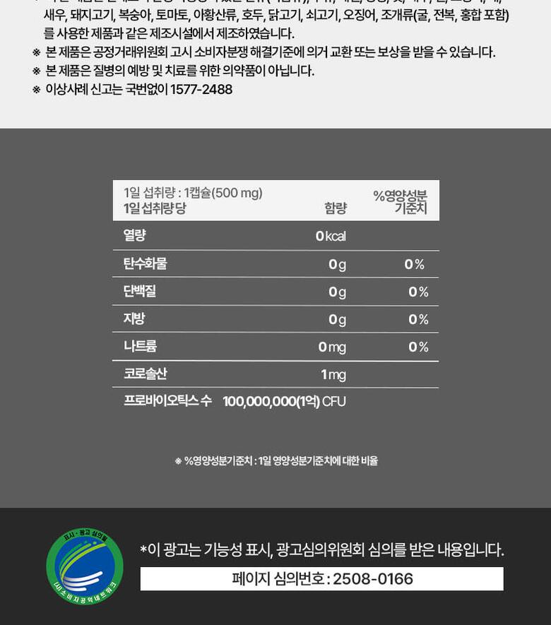 | 9. 섭취량, 섭취방법, 섭취시 주의사항 및 부작용 발생 | 상세 설명페이지 참조 |
