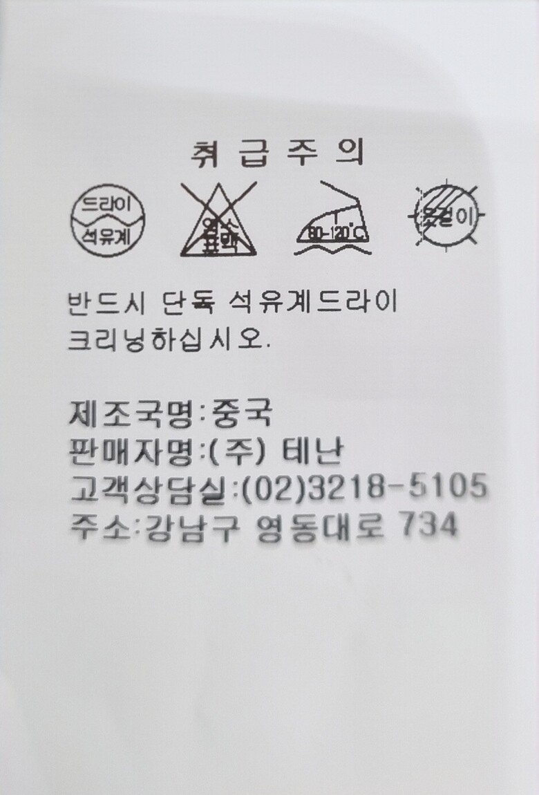 | 6. 세탁방법 및 취급시 주의사항 | 반드시 단독 석유계드라이 크리닝하십시오. |