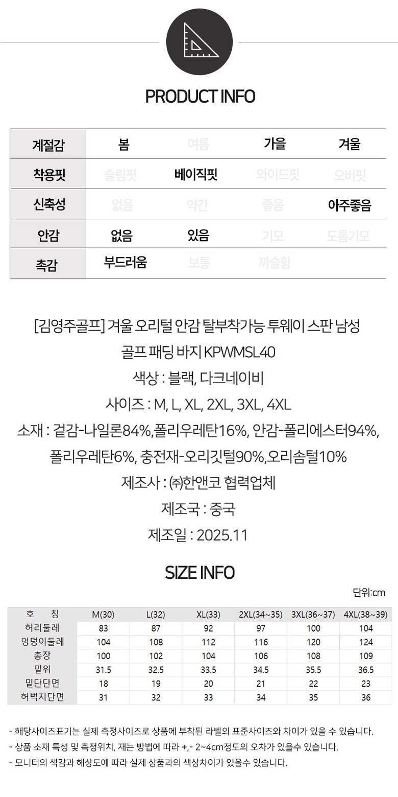 [김영주골프] 겨울 오리털 안감 탈부착가능 투웨이 스판 남성 골프 패딩 바지 KPWMSL40
