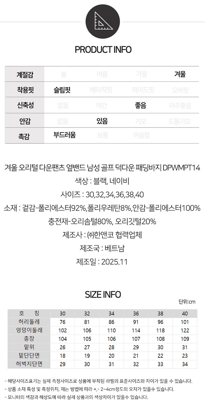 [김영주골프] 겨울 오리털 다운팬츠 옆밴드 남성 골프 덕다운 패딩바지 DPWMPT14