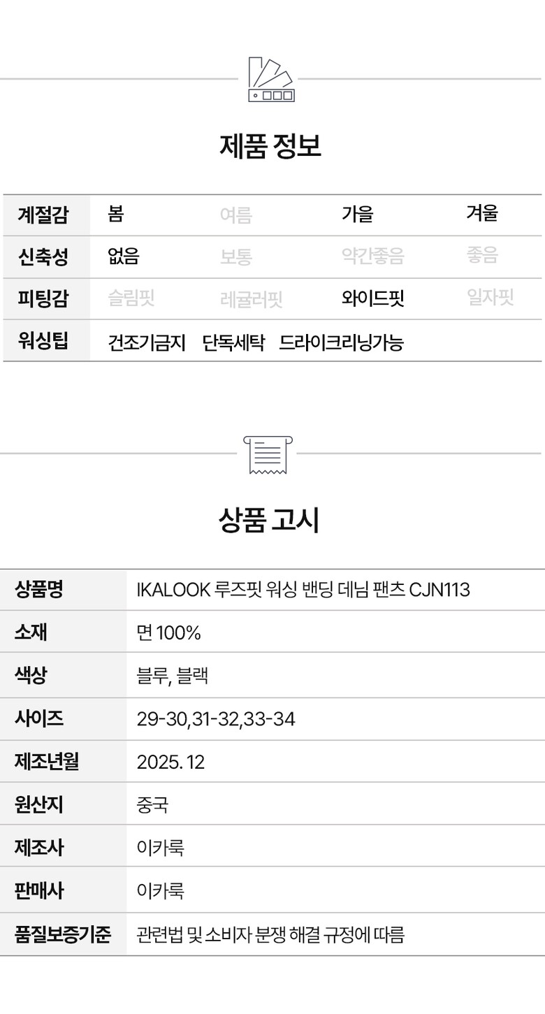 IKALOOK 루즈핏 워싱 밴딩 데님 팬츠 CJN113