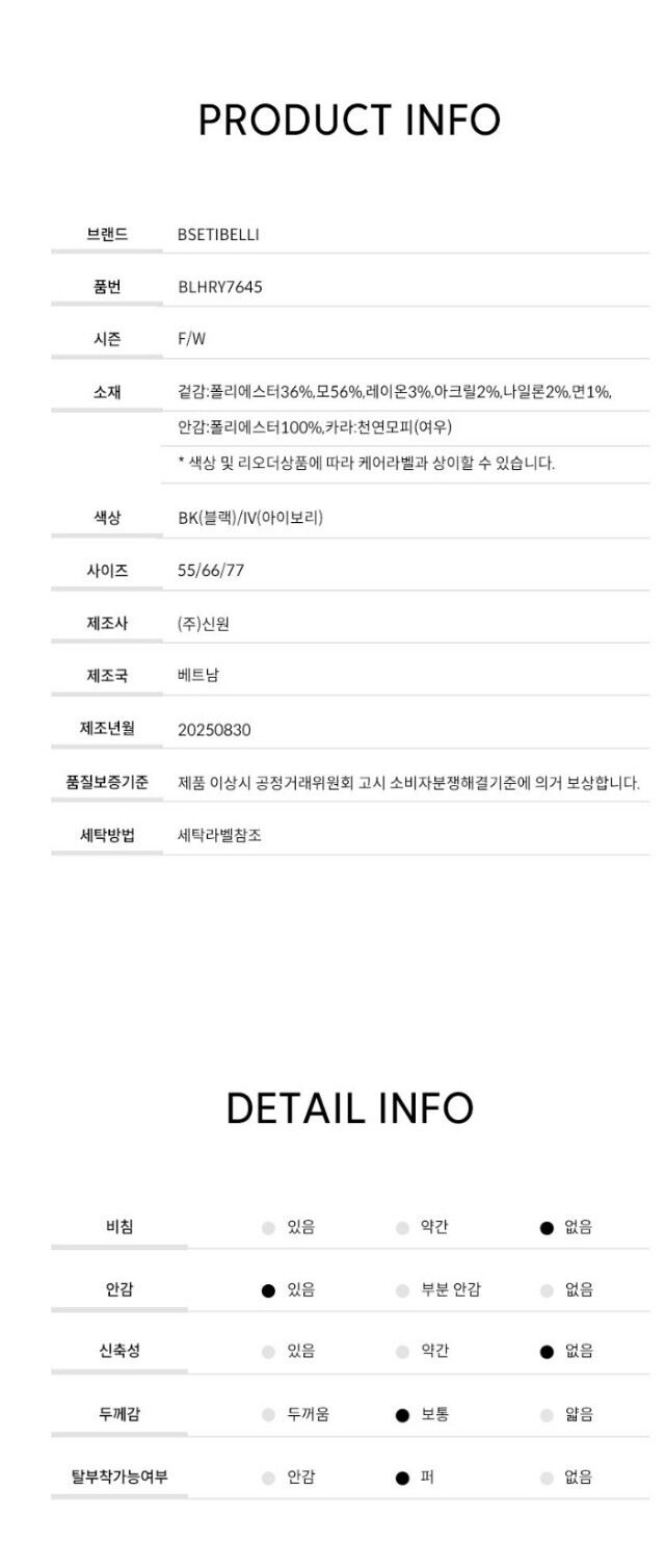 | 1. 제품 소재 (섬유의 조성 또는 혼용률을 백분율로 표시, 기능성인 경우 성적서 또는 허가서) | 상품상세참조 |