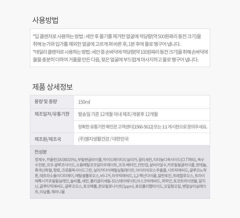 | 4. 사용방법 | 딥 클렌저:세안 후 물기를 제거한 얼굴에 적당량(약 500원짜리 동전 크기)을 취해 눈가와 입가를 제외한 얼굴에 고르게 펴 바른 후, 1분 후에 물로 헹구어 냅니다. 데일리 클렌저:세안 중 손바닥에 적당량(약 100원짜리 동전 크기)을 취해 손바닥에 물을 충분히 더하여 거품을 만든 다음, 젖은 얼굴에 부드럽게 마사지하고 물로 헹구어 냅니다. |